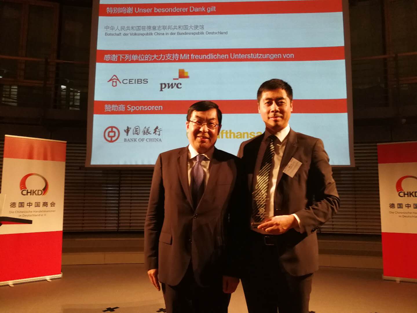 德国中国商会监护人中华人民共和国驻德大使史明德先生、商会主席单位代表中国银行法兰克福分行副行长王芳女士、德国工业联合会国际市场部主任施特拉克先生,德国中国商会理事单位代表以及中德工商界嘉宾100余人齐聚柏林,共同见证在德中资企业的荣耀时刻。