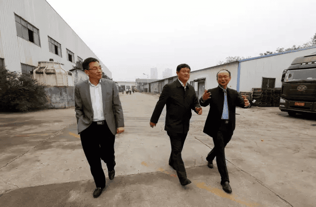 ↗ 2016年10月,楚天科技董事长兼总裁唐岳、副总裁周飞跃,陪同人福医药集团总裁李杰(中)考察建设中的项目